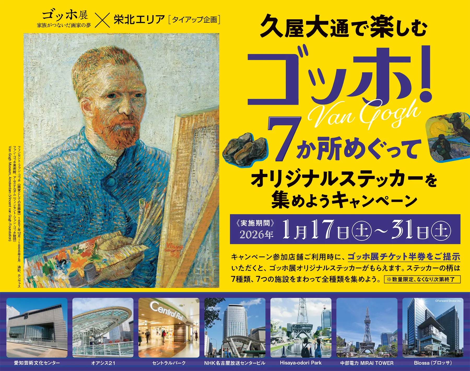 愛知県美術館のある栄北エリアの地域活性化プロジェクトが、ゴッホ展とコラボします!(愛知芸術⽂化センター、NHK名古屋放送センタービル、オアシス21、セントラルパーク、中部電⼒MIRAI TOWER、Hisaya-odori Park、Blossaの7施設からなるプロジェクト)7か所のキャンペーン参加店舗ご利⽤時に「ゴッホ展家族がつないだ画家の夢」展覧会チケット半券をご提⽰いただくと、ゴッホ展オリジナルステッカーがもらえます。ステッカーの柄は7種類、7つの施設をまわって全種類集めよう!